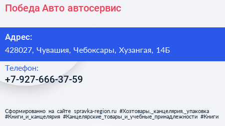 Победа Авто, автосервис по адресу 428027, Чувашия, Чебоксары, Хузангая, 14Б в дальнейшем Организация, размещена в следующих категориях:
