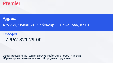 Premier по адресу 429959, Чувашия, Чебоксары, Семёнова, вл10 в дальнейшем Организация, размещена в следующих категориях: