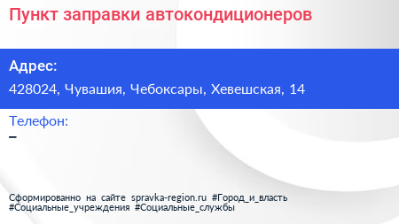 Пункт заправки автокондиционеров по адресу 428024, Чувашия, Чебоксары, Хевешская, 14 в дальнейшем Организация, размещена в следующих категориях:
