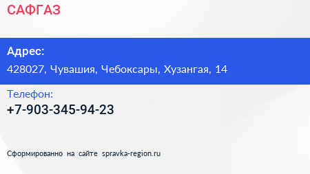 САФГАЗ по адресу 428027, Чувашия, Чебоксары, Хузангая, 14 в дальнейшем Организация, размещена в следующих категориях: