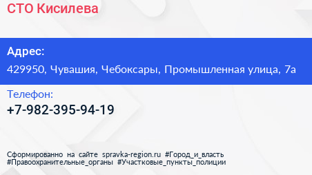 СТО Кисилева по адресу 429950, Чувашия, Чебоксары, Промышленная улица, 7а в дальнейшем Организация, размещена в следующих категориях: