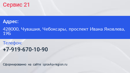 Сервис 21 по адресу 428000, Чувашия, Чебоксары, проспект Ивана Яковлева, 19Б в дальнейшем Организация, размещена в следующих категориях: