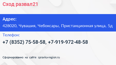Сход-развал21 по адресу 428020, Чувашия, Чебоксары, Пристанционная улица, 5д в дальнейшем Организация, размещена в следующих категориях: