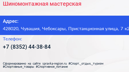Шиномонтажная мастерская по адресу 428020, Чувашия, Чебоксары, Пристанционная улица, 7 к2 в дальнейшем Организация, размещена в следующих категориях: