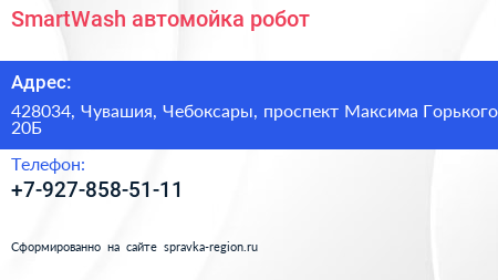 SmartWash, автомойка-робот по адресу 428034, Чувашия, Чебоксары, проспект Максима Горького, 20Б в дальнейшем Организация, размещена в следующих категориях: