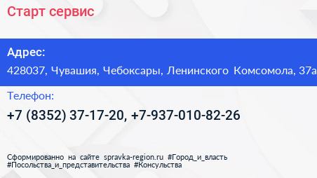 Старт-сервис по адресу 428037, Чувашия, Чебоксары, Ленинского Комсомола, 37а в дальнейшем Организация, размещена в следующих категориях: