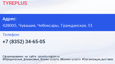 TYREPLUS по адресу 428005, Чувашия, Чебоксары, Гражданская, 51 в дальнейшем Организация, размещена в следующих категориях: