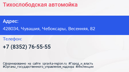 Тихослободская, автомойка по адресу 428034, Чувашия, Чебоксары, Весенняя, 82 в дальнейшем Организация, размещена в следующих категориях: