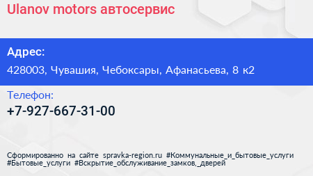 Ulanov motors, автосервис по адресу 428003, Чувашия, Чебоксары, Афанасьева, 8 к2 в дальнейшем Организация, размещена в следующих категориях: