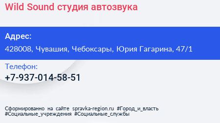 Wild Sound, студия автозвука по адресу 428008, Чувашия, Чебоксары, Юрия Гагарина, 47/1 в дальнейшем Организация, размещена в следующих категориях: