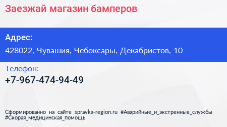 Заезжай, магазин бамперов по адресу 428022, Чувашия, Чебоксары, Декабристов, 10 в дальнейшем Организация, размещена в следующих категориях:
