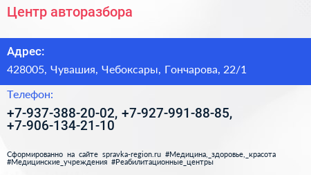 Центр авторазбора по адресу 428005, Чувашия, Чебоксары, Гончарова, 22/1 в дальнейшем Организация, размещена в следующих категориях: