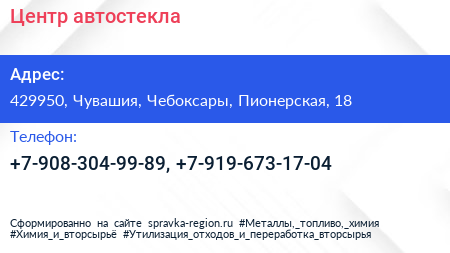 Центр автостекла по адресу 429950, Чувашия, Чебоксары, Пионерская, 18 в дальнейшем Организация, размещена в следующих категориях: