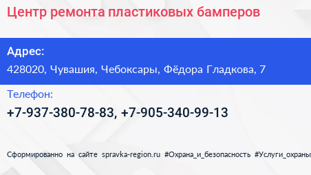 Центр ремонта пластиковых бамперов по адресу 428020, Чувашия, Чебоксары, Фёдора Гладкова, 7 в дальнейшем Организация, размещена в следующих категориях: