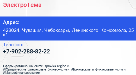 ЭлектроТема по адресу 428024, Чувашия, Чебоксары, Ленинского Комсомола, 25 к1 в дальнейшем Организация, размещена в следующих категориях: