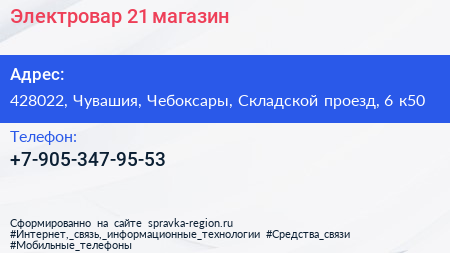 Электровар 21, магазин по адресу 428022, Чувашия, Чебоксары, Складской проезд, 6 к50 в дальнейшем Организация, размещена в следующих категориях: