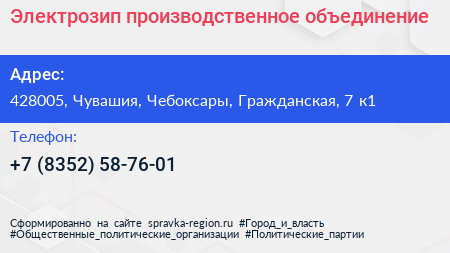 Электрозип, производственное объединение по адресу 428005, Чувашия, Чебоксары, Гражданская, 7 к1 в дальнейшем Организация, размещена в следующих категориях: