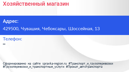 Хозяйственный магазин по адресу 429500, Чувашия, Чебоксары, Шоссейная, 13 в дальнейшем Организация, размещена в следующих категориях:
