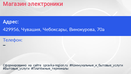 Магазин электроники по адресу 429956, Чувашия, Чебоксары, Винокурова, 70а в дальнейшем Организация, размещена в следующих категориях: