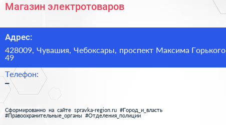 Магазин электротоваров по адресу 428009, Чувашия, Чебоксары, проспект Максима Горького, 49 в дальнейшем Организация, размещена в следующих категориях: