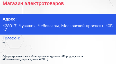 Магазин электротоваров по адресу 428017, Чувашия, Чебоксары, Московский проспект, 40Б к7 в дальнейшем Организация, размещена в следующих категориях: