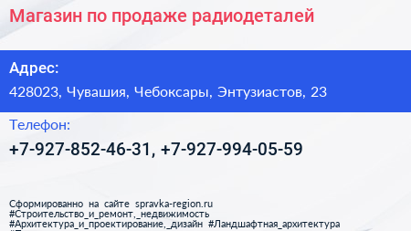 Магазин по продаже радиодеталей по адресу 428023, Чувашия, Чебоксары, Энтузиастов, 23 в дальнейшем Организация, размещена в следующих категориях: