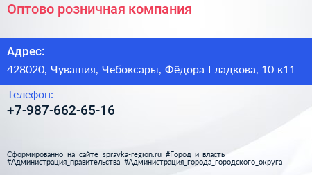 Оптово-розничная компания по адресу 428020, Чувашия, Чебоксары, Фёдора Гладкова, 10 к11 в дальнейшем Организация, размещена в следующих категориях: