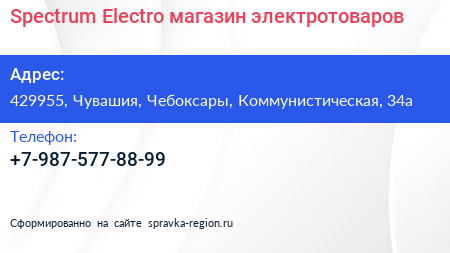 Spectrum Electro, магазин электротоваров по адресу 429955, Чувашия, Чебоксары, Коммунистическая, 34а в дальнейшем Организация, размещена в следующих категориях: