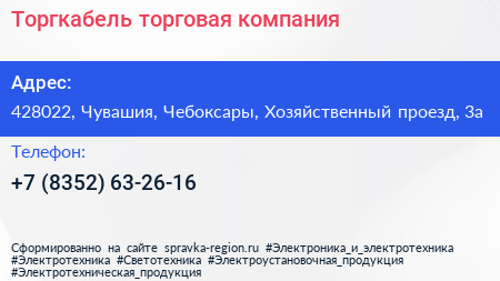 Торгкабель, торговая компания по адресу 428022, Чувашия, Чебоксары, Хозяйственный проезд, 3а в дальнейшем Организация, размещена в следующих категориях: