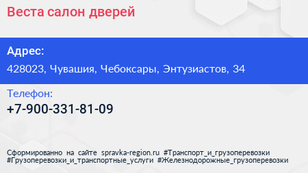 Веста, салон дверей по адресу 428023, Чувашия, Чебоксары, Энтузиастов, 34 в дальнейшем Организация, размещена в следующих категориях: