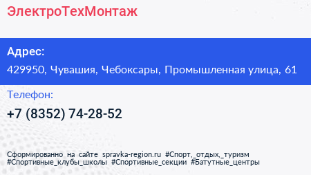 ЭлектроТехМонтаж по адресу 429950, Чувашия, Чебоксары, Промышленная улица, 61 в дальнейшем Организация, размещена в следующих категориях: