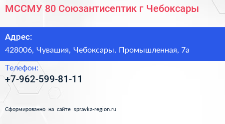 МССМУ-80 Союзантисептик г. Чебоксары по адресу 428006, Чувашия, Чебоксары, Промышленная, 7а в дальнейшем Организация, размещена в следующих категориях: