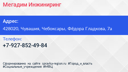 Мегадим-Инжиниринг по адресу 428020, Чувашия, Чебоксары, Фёдора Гладкова, 7а в дальнейшем Организация, размещена в следующих категориях: