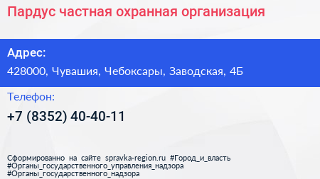 Пардус, частная охранная организация по адресу 428000, Чувашия, Чебоксары, Заводская, 4Б в дальнейшем Организация, размещена в следующих категориях: