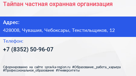 Тайпан, частная охранная организация по адресу 428008, Чувашия, Чебоксары, Текстильщиков, 12 в дальнейшем Организация, размещена в следующих категориях:
