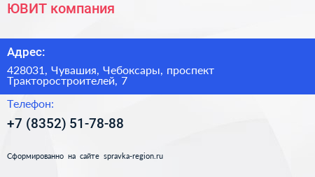 ЮВИТ, компания по адресу 428031, Чувашия, Чебоксары, проспект Тракторостроителей, 7 в дальнейшем Организация, размещена в следующих категориях: