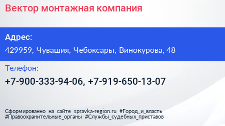 Вектор, монтажная компания по адресу 429959, Чувашия, Чебоксары, Винокурова, 48 в дальнейшем Организация, размещена в следующих категориях: