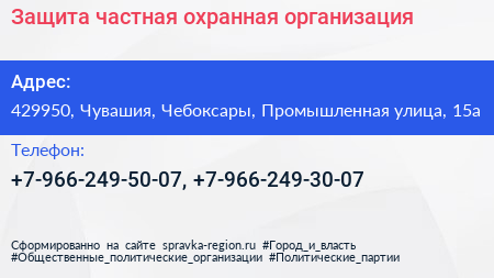 Защита, частная охранная организация по адресу 429950, Чувашия, Чебоксары, Промышленная улица, 15а в дальнейшем Организация, размещена в следующих категориях: