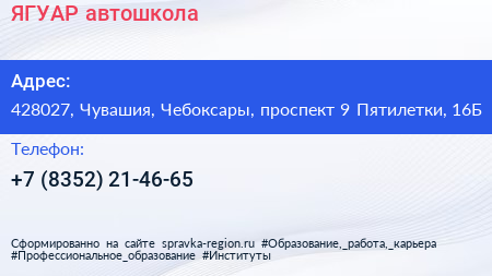 ЯГУАР, автошкола по адресу 428027, Чувашия, Чебоксары, проспект 9 Пятилетки, 16Б в дальнейшем Организация, размещена в следующих категориях:
