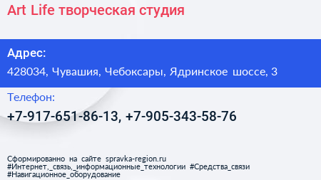 Art Life, творческая студия по адресу 428034, Чувашия, Чебоксары, Ядринское шоссе, 3 в дальнейшем Организация, размещена в следующих категориях: