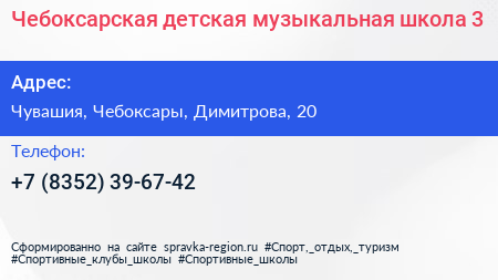 Чебоксарская детская музыкальная школа №3 по адресу Чувашия, Чебоксары, Димитрова, 20 в дальнейшем Организация, размещена в следующих категориях: