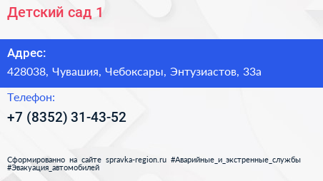 Детский сад №1 по адресу 428038, Чувашия, Чебоксары, Энтузиастов, 33а в дальнейшем Организация, размещена в следующих категориях: