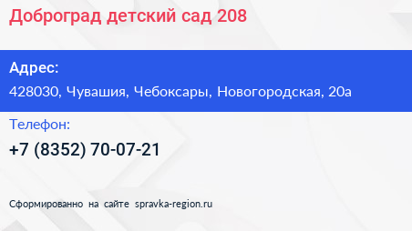 Доброград, детский сад №208 по адресу 428030, Чувашия, Чебоксары, Новогородская, 20а в дальнейшем Организация, размещена в следующих категориях: