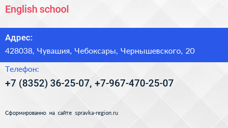 English school по адресу 428038, Чувашия, Чебоксары, Чернышевского, 20 в дальнейшем Организация, размещена в следующих категориях: