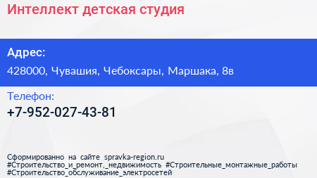 Интеллект, детская студия по адресу 428000, Чувашия, Чебоксары, Маршака, 8в в дальнейшем Организация, размещена в следующих категориях: