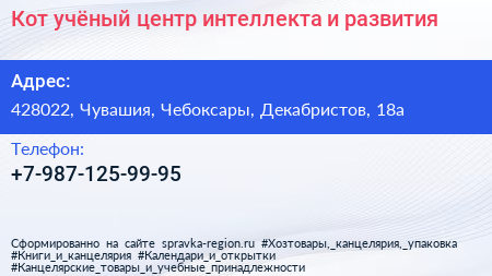 Кот учёный, центр интеллекта и развития по адресу 428022, Чувашия, Чебоксары, Декабристов, 18а в дальнейшем Организация, размещена в следующих категориях: