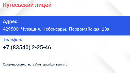 Кугесьский лицей по адресу 429500, Чувашия, Чебоксары, Первомайская, 13а в дальнейшем Организация, размещена в следующих категориях: