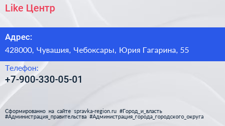 Like Центр по адресу 428000, Чувашия, Чебоксары, Юрия Гагарина, 55 в дальнейшем Организация, размещена в следующих категориях: