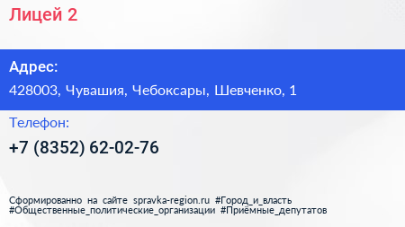 Лицей №2 по адресу 428003, Чувашия, Чебоксары, Шевченко, 1 в дальнейшем Организация, размещена в следующих категориях:
