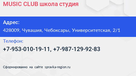 MUSIC CLUB, школа-студия по адресу 428009, Чувашия, Чебоксары, Университетская, 2/1 в дальнейшем Организация, размещена в следующих категориях: